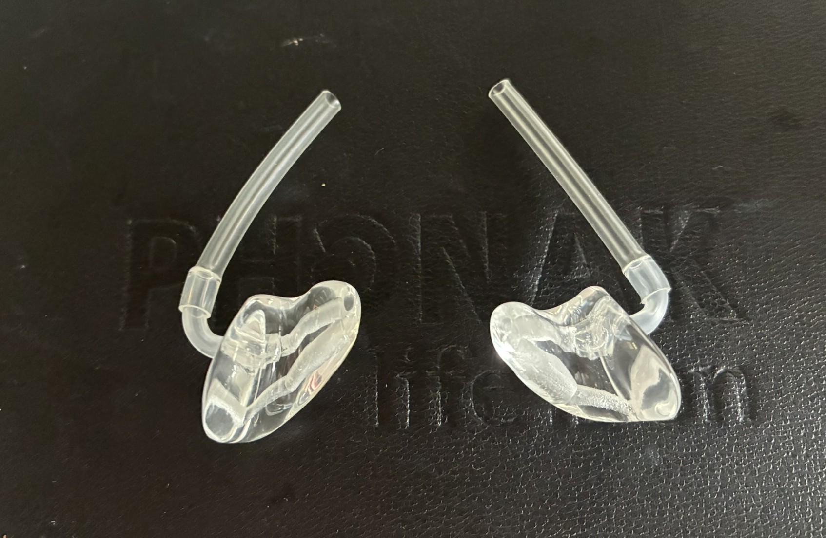 ご希望は「運動中にも落ちにくい耳穴型」でしたが、まずは音質や性能をしっかり確認していただくため、フォナック社の耳掛け型補聴器を両耳でお試しいただくことに。